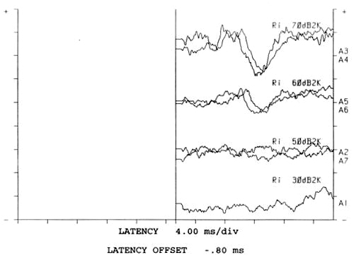 The ABR has been used the longest for estimating thresholds in babies. It is used with broadband stimuli (clicks), or with frequency-specific stimuli (tone pips). The advantage of click-based ABR is that the clicks evoke a large wave V response that is relatively easy to read. Measures made with clicks are correlated with later behavioral thresholds in the 2-4 kHz region (Gorga, Johnson, Kaminksi, Beauchaine, Garner, & Neely; 2006). However, it is important to note case reports that show individual babies with unusually configured audiograms who do not follow this rule and would be misdiagnosed by click-only testing (Stapells, 2000a). To avoid this problem, ABR testing can also be done using brief tones. These tone-ABR tests give more frequency-specific results than click-ABR, avoiding most configuration problems (Stapells, 2000b). The waves they elicit, however, are less robust in appearance than a click-evoked ABR wave V, making them harder to read, particularly if the clinician has not received training and mentorship. These pros and cons may help to explain why we still see both stimulus types being used, and why some clinics choose to use them in combination. Figure 1 shows an example of tone-ABR threshold estimation for a baby seen in the H.A. Leeper Speech and Hearing Clinic at the University of Western Ontario. The results are shown for 2000 Hz and responses were observed at test levels of 60 dB nHL and above. This process gets repeated at other test frequencies (and in the other ear!) until at least one low and one high frequency threshold has been obtained and replicated.