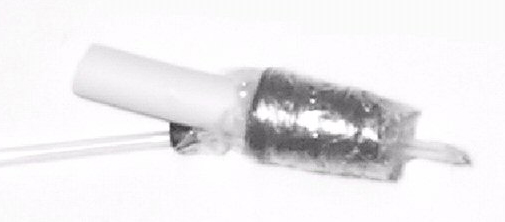 Figure 2. An example of a probe tube microphone attached to an eartip to ease the insertion of tube/eartip combination in a baby's ear. The tube has been attached with Moisture Guard tape so that it extends past the eartip by 3 mm. The external marker on the tube is inserted flush with the opening of the ear canal.