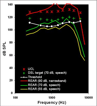 Let's take this back to the hearing aid fitting for a moment. Assume that we had a complete audiogram done using the technique shown in Figure 1, including ear-specific thresholds for both air- and bone-conducted stimuli, for low (500 Hz) and high (2000 Hz) frequencies, and that the results (along with the rest of the test battery) told us that a sensorineural hearing loss had been found. However, that doesn't necessarily mean that we can type a "60 dB" threshold into hearing aid fitting software.