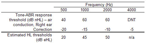 Table 1. Tone-ABR assessment results in dB nHL and their correction to estimated HL values.