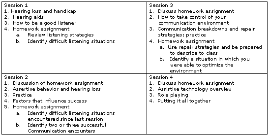 Each subject completed the Hearing Handicap Inventory for the Elderly (HHIE) at approximately 3 weeks post fitting (first follow-up visit). The eight groups met four times for a total of six hours during the second month of hearing aid use. Each of the eight groups received audiologic rehabilitation and counseling designed to provide them with strategies for maximizing benefit of amplification. An outline of the rehabilitation program is contained in Figure 1.