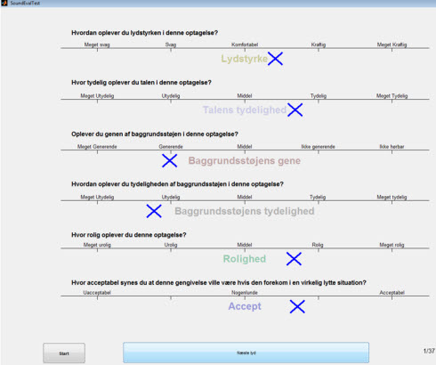 Danish equivalents of the following response categories were used: Loudness: very soft, soft, comfortable, loud, very loud. Speech clarity: very unclear, unclear, average, clear, very clear. Annoyance of background noise: very annoying, annoying, average, not annoying, not audible. Clarity of background noise: very unclear, unclear, average, clear, very clear. Calmness of the recordings: very uneasy, uneasy, average, calm, very calm. Overall acceptability: unacceptable, tolerable, acceptable.