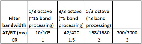 Table 1. Values of the filter bandwidths, attack/release times, and compression ratios investigated in the study.