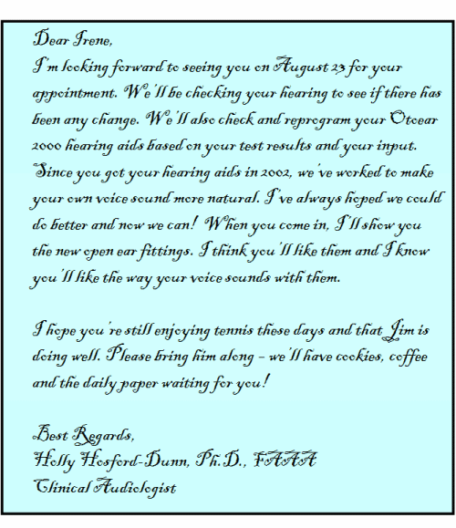 Most patients enjoy receiving a note as shown in Figure 1, not only because it's personalized, but because it reminds them of their appointment, informs them of services to expect at the appointment, and lets them know about potential solutions to their problem(s).They develop an a priori positive attitude toward their appointment and the possibility of purchasing an open ear fitting. If they had such a letter in hand, they might change their plans about pursuing the "two for one" offer they'd just received on a bulk mail card from a chain competitor in your area.