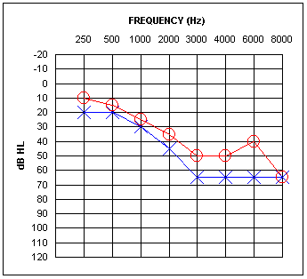 Otoscopic examination - accomplished slowly and carefully - revealed clean ear canals and normal tympanic membranes bilaterally. Audiometric testing was conducted with extreme caution. Headphones were placed carefully over the patient's ears. Pure tone threshold testing was done in 1 dB increments in ascending order. This procedure eliminated the risk of exposing the patient to sounds he would perceive as uncomfortably loud. Audiometric results revealed mild to moderate sensorineural hearing loss from 1000-8000 Hz in the right ear, and mild to moderately severe sensorineural hearing loss in the left ear (see Figure 1 audiogram). Speech reception thresholds and speech discrimination scores could not be evaluated due to the patient's sound sensitivity. His most comfortable loudness level was 50 dB HL. However, at 55 dB HL, the patient reported being very uncomfortable. Loudness discomfort levels (repeated twice) suggested phonophobia because the patient would not or could not tolerate any sound greater than 10 dB SL (sensation level). For this reason, the patient's tinnitus could not be matched for pitch or loudness. At the conclusion of audiometric testing, the patient showed signs of fatigue.