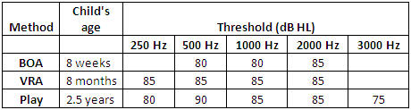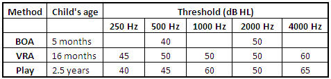 Table 3. Thresholds for the same child obtained via BOA at age six weeks, VRA at age six months and play audiometry at age 2.5 years. Adapted from Madell & Flexer (2008).