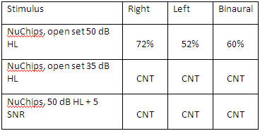 His speech perception is fair to good with 76% in the right ear, 74% in the left ear and 88% binaurally. With the FM, it's 96%. His scores for soft speech and speech in noise are not good but he is doing well with the FM in those conditions. Therefore, this is a child I would continue to closely monitor but would not necessarily see as an immediate need for a CI.