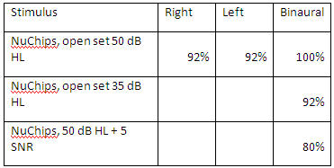 Within a period of a few months, her speech perception was 80% in the right ear with the implant. It was 7% in the left ear with the hearing aid, 88% binaurally, 54% for soft speech and 48% for normal conversation in noise.