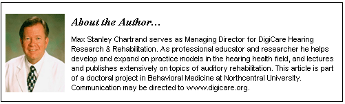 - To Combine Maximum Self-Reliance with Acceptance of a Level of Physical Dependence- As stated earlier, Russell will be undergoing cochlear implantation. By itself, we can expect a speech discrimination ability that may be as little as 50% of that of normal hearing individuals in quiet listening environments. In noisy circumstances, however, speech understanding can plunge no matter how successful the cochlear implant performance (Beck, 2005; Namasivayan, 2004). Of course, the fact that his loss is post-linguistic and occurred recently will aid significantly in restoring closer to normal central auditory processing than for an individual whose loss is long-standing. To bring our patient closer to normality--or communicative wholeness--will require extensive auditory rehabilitation (Chartrand, 1999). Developing self-reliance will require utilization of assistive technology to fill the gaps where auditory compensation (via cochlear implantation) leaves off (Diles and Diles, 2005). Russell will need to plan toward optimal self-reliance, but also be willing to accept assistance from his family, friends, and others, when necessary.