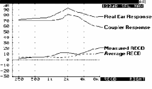 The most useful application of the RECD is for the prediction of real-ear hearing aid output. RECD allows us to evaluate the difference between output in the real-ear and the 2cc coupler, so that real-ear hearing aid output (real-ear aided response or real-ear saturation response) can be measured within approximately 2 dB of target (Seewald & Scollie, 1999). Simply stated, the RECD is used to convert hearing aid performance measured in a 2cc coupler into real-ear hearing aid performance.