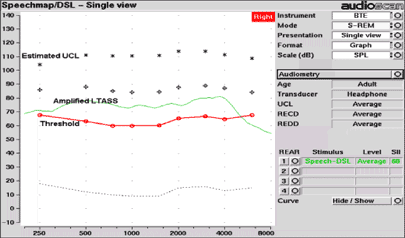 Figure 9. Screen shot of the Audioscan Verifit utilizing DSL, showing the amplified LTASS above threshold (Audioscan, 2006a)