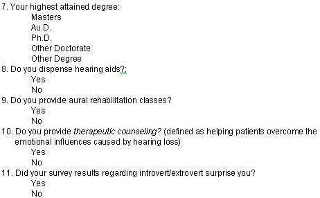 The basis for information in this survey was a questionnaire developed by this author to explore various relationships among factors that might be influential in audiology practice. Cross-tabulations were calculated and a number of associations were revealed. This paper will present some of these findings and discuss their possible implications.