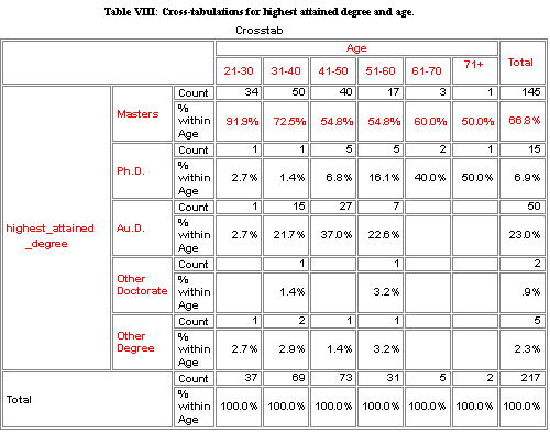 Table VIII shows cross-tabulations for highest attained degree and age, revealing a preponderance of respondents between ages 21 and 70 hold a Masters Degree. A total of 23 percent of all respondents held an Au.D.