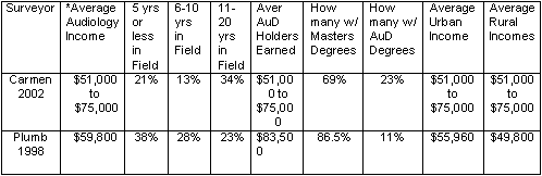 Various surveys of audiologists have recently been conducted in the industry as reported by Prendergast and Kelley (2002), Strom (2001), and Plumb (1998), where they looked at the demographics of audiologists and their practice. Information about ourselves and our practice can be helpful in making business decisions, and perhaps providing better services to our patients.