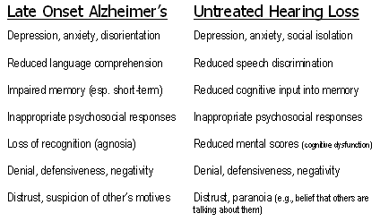 But, just as an auditory evaluation was lacking in the vignette above, it is absent in most cases of AD (Chartrand, 2001b; Ullman et al, 1989; Peters, Potter, and Scholar, 1988). Other cognitive conditions, such as depression, anxiety and anti-social behaviors caused by previously undiagnosed and uncorrected hearing loss have been documented in the literature (Chartrand, 2001a).