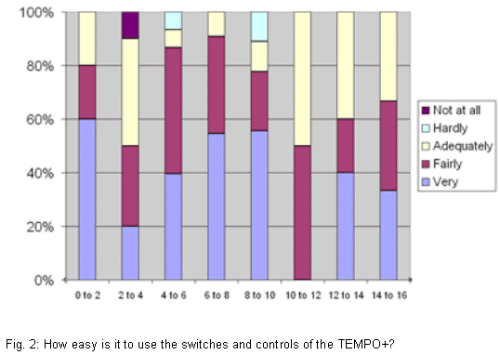 A custom made questionnaire of 50 questions was designed. Themes included: biographical information, TEMPO+ switches and controls, handling of the TEMPO+, general questions on the TEMPO+ and questions about TEMPO+ accessories. Most questions had multiple-choice options for answers, such as 'never', 'rarely', 'sometimes', 'often' and always. Some questions were open-ended. The questionnaire was available in German and English.
