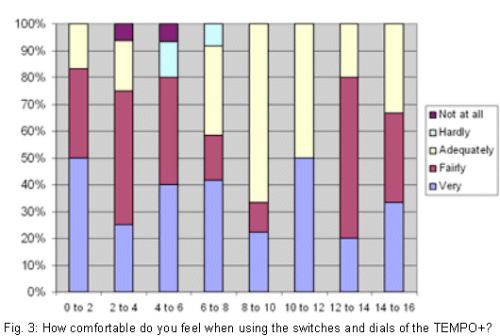 Figure 3 shows positive results to subjects' feeling comfortable with using the switches and dials of the TEMPO+. The TEMPO+ is modular in design to promote a wide variety of wearing options. 70% of parents reported having more than one battery pack. Of these, 49% rarely change the battery pack and 51% feel ''very comfortable'' when doing so. 41.2% of parents ''rarely'' change the their earhook, as most are provided with the pediatric earhook. Considering the weight and size of the TEMPO+, battery pack options and different earhooks, the majority of parents rated the TEMPO+ as ''very'' or ''fairly'' comfortable for their children to wear. (Fig 4)