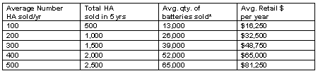 Average retail dollar figure based on $1.25/battery. An average dispensing office/practice dispenses 250 hearing instruments per year, and that office could see battery revenues of over $40,000.