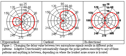 Regarding fixed directionality, the professional has a choice of three different fixed polar patterns (hypercardioid, cardioid, or bi-directional) or back to omni, depending on the needs of the patient (see Figure 1 for a graphic representation of free field polar plots). Programming the device with a particular fixed polar pattern will electronically fix the delay time and the result is the chosen pattern. However, a fixed polar pattern may not be ideal for all noisy situations.