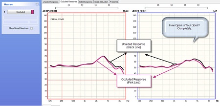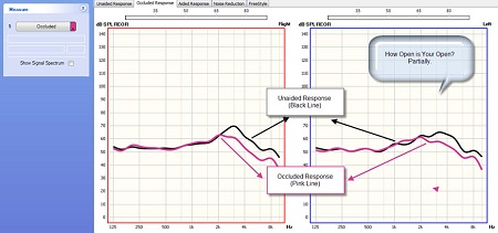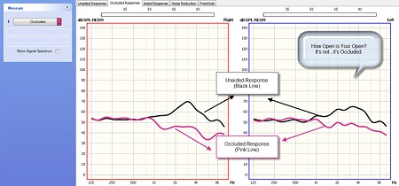 If the fitting is truly open, the two curves should overlay one another, indicating the responses are virtually the same. In this case, placement of the dome or the receiver in the ear canal does not create occlusion. If the fitting is partially occluded (Figure 2) or closed (Figure 3), the occluded response curve will fall below the initial (unaided) curve. The effect can range from slight to significant.
