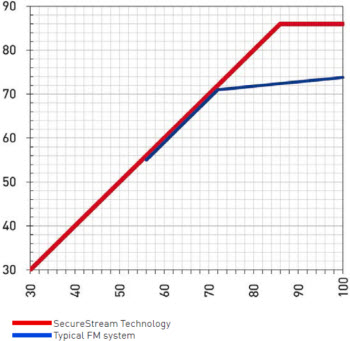 The input/output curve in Figure 1 shows the wider dynamic range of digital transmission of sound known as Secure Stream Technology (SST) in the Comfort Digisystem from Comfort Audio, as compared to a typical FM system. When there is insufficient dynamic range in any part of the transmission chain, the loud parts of speech may be distorted while the weaker sounds of speech may be masked by background noise, and speech understanding will be impacted.