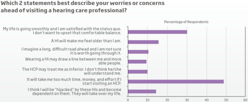 Responses of 749 non-users to the question, "Which 2 statements best describe your worries or concerns about visiting a hearing care professional?" from Oticon survey. For larger view, Click Here (PDF).