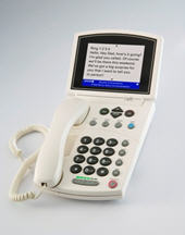 The one on display here is the Hamilton Captel 800i Caption Phone. What makes this phone really unique is that not only is it an amplified telephone (providing up to 40 dB of amplification), it also enables the listener to actually see what the caller is saying, all without the involvement of traditional Relay Operators. One press of a button prior to placing a call or prior to picking up a call immediately connects to a caption operator who types out the caller's conversation in real time, without ever directly communicating with either party.