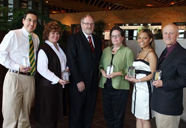 The 2008 Oticon Focus on People Awards winners were selected from among 200 nominees. Featured L-R: Todd Landsberg, AuD of Eugene Speech and Hearing Center in Eugene, OR (Practitioner Category);Lynn Rousseau of Gainesville, FL (Advocacy Category);Peer Lauritsen, President of Oticon, Inc.;Cindy Dyer of Alexandria, VA (Adult Category);Mariella Paulino of the Bronx, NY (Student Category);and Doug Wernke, M Ed of the South Dakota School for the Deaf in Rapid City, SD (Pediatric Practitioner Category).