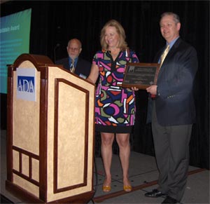 AFA Chair Deborah Price, Au.D. (center), presents the "David P. Goldstein, Ph.D. Outstanding Audiologist Award" to Larry Engelmann, Au.D. (right) at the opening session of the 2008 ADA Convention.