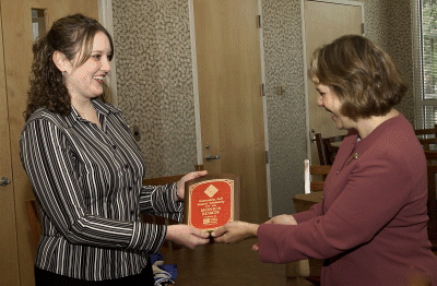 Au.D. students at Ball State University and Central Michigan University were honored by the Audiology Foundation of America at luncheon ceremonies held on September 24, 2003 and October 31, 2003, respectively. Winners of the 2003 Outstanding Au.D. Student Scholarships, Monica Burch and Trisha Ostermeier received plaques from the AFA during the ceremonies.