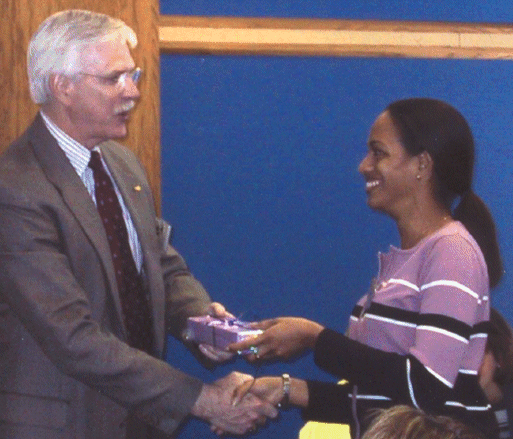 AFA Chair Ken Lowder presents UFL AuD student Malika Charlton with an otoscope at the professional luncheon ceremony.