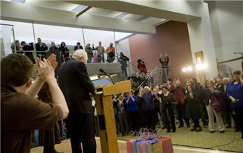 "I see this center being a new bridge between the deaf and hearing communities here at RIT," Buckley said to the more than 200 students, faculty, staff alumni and community members who packed the Fireside Lounge, directly below the new center, for a ceremonial ribbon cutting. Visitors were given tours and souvenirs adorned with the center's logo.