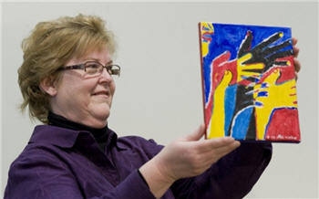 Barbara Ray Holcomb displays "Sign Internationally," a painting by NTID alum Nancy (Oyos) Rourke.