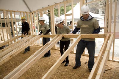 American Academy of Audiology Executive Director Cheryl Kreider Carey, CAE joined Lauritsen in a good natured wall raising challenge in which she and Lauritsen each donned hard hats and headed a construction crew attempting to be the first to raise the walls. "This unique humanitarian effort reflects the importance of the relationship between the hearing care industry and our members in achieving goals that benefit people with hearing loss," Carey noted. "We are honored that Oticon has chosen this very public effort to celebrate the American Academy of Audiology's first 20 years of advancing the profession of audiology through leadership, advocacy, education, public awareness, and support of research. It is a wonderful way to demonstrate to the general public the caring and commitment to improving life that are at the core of our profession."