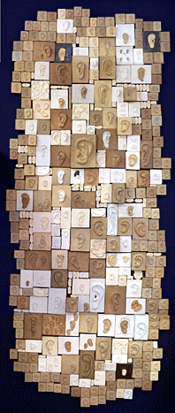 The ''Wall of 1000 Ears'' is made from seven varieties of clay and porcelain. Every tile is hand made and modeled and then fired to the maturing temperature of the clay body. Surface embellishment was primarily left to the atmosphere of the kiln, with a scant amount of post-glazing application for accent. Mounted on 5 separate wooden stretchers the installation encompassed more than 40 square feet.
