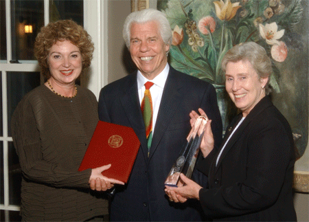 Photo Caption: Patricia Simmons, MD, vice chairman of the Board of Regents at the University of Minnesota and a pediatrician at the Mayo Clinic (l) and Deborah E. Powell, MD, dean of the University of Minnesota's Medical School (r) present Starkey founder and CEO William F. Austin with an Award of Distinction.