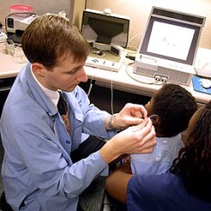 Stuart Tomlin, a second-year doctor of audiology student, gets practice conducting hearing evaluations and fitting patients for hearing aids.