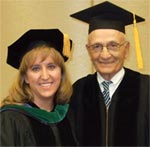 AFA founder David Goldstein, Ph.D., pictured here with Arizona School of Health Sciences (ASHS) Audiology Chair Tabitha Parent Buck, Au.D., received an honorary degree during August graduation ceremonies at the campus in Mesa, AZ."It was a privilege to see Dr. David Goldstein receive an honorary degree, the Doctor of Humane Letters, from A.T. Still University," said Parent Buck. "He was selected for this honor as a visionary, an educator and a mentor whose dedication to the profession of audiology and efforts to effect necessary changes have significantly impacted the education and practice of audiology and created the reality of the Au.D. degree."