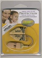 Ear Gear Mini Curved Corded in beige has been chosen by Oticon Pediatrics to be included in all of their Pediatric kits from birth to 18 years of age. This model of Ear Gear has been specially created for Oticon and includes a unique Safari graphic imprinted on the Ear Gear sleeve. This model also features a lightweight plastic clip . The Ear Gear/ Oticon Safari Mini Curved includes full color instructions specifically created for installation and use of this model by Oticon's clients."We believe that Ear Gear is a valuable accessory for active children of any age, to give parents greater peace of mind and protect these important devices from loss or damage from sweat and dirt. Whether it's worn by a baby to prevent loss, a 6 year old child at the beach, a 12 year old competitive soccer player or a teen hiking in the woods, Ear Gear helps kids live their everyday adventures without having to worry about their hearing aids AND without having to put them away in a box during high energy activities. It's a great match with Safari instruments".