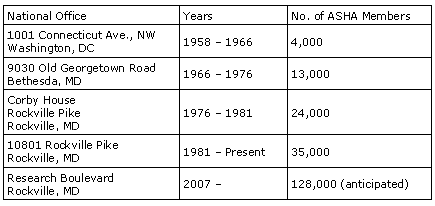 ASHA's current National Office at 10801 Rockville Pike in Rockville Maryland is the fourth National Office in the history of the Association - not counting the home of Lee Edward Travis in Iowa City, IA - where it all started in May 1925. When ASHA's first executive secretary Kenneth O. Johnson opened the first ASHA National Office in 1958, the Association numbered 4,000 members and two staff members. As many of you know, the other staff member at that time was Luella Cannon - who still works at the ASHA National Office - 47 years later! Over the years, ASHA has called three other addresses (see table below) "home".