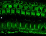 When claudin-9 is mutated, potassium floods the wrong part of the ear's sensory cells, killing a layer of them, as indicated by the arrow in this image. Credit: University of Iowa