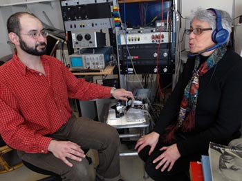 Here Senior Research Scientist Charlotte Reed speaks while the device she helped develop converts the sounds into vibrations. Graduate research assistant Theodore Moallem uses the device to read her lips and feel the sounds.