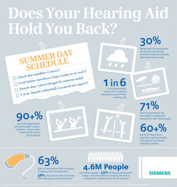 Piscataway, NJ, June 27, 2011— Siemens Hearing Instruments, Inc. today announced the findings of a recent survey of 500 hearing aid wearers, showing the need for a more robust hearing device to accommodate today's active lifestyles. According to the study, Americans want to lead a more vibrant daily life, but feel bound by the shortcomings of today's traditional hearing devices. Siemens fills the gap with the new Aquaris, the first truly waterproof, dustproof and shock-resistant hearing aid.