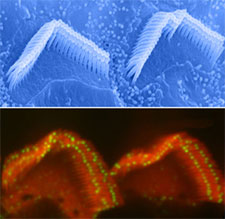 Top: Scanning electron microscopy shows the stair-step pattern of stereocilia. Bottom: Fluorescence microscopy image shows the presence of CDH23 (green) at the point where each short stereocilium (red) meets the side of its taller neighbor.