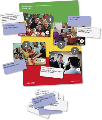 Using photo cards depicting real-life situations, patients select the situations that best match their daily lives and then sort the cards according to how easy or challenging each situation is for them to manage. Markers are used to indicate how important each situation is for the individual's lifestyle. Strategy cards that suggest communication and technology solutions are then applied to each scenario. Blank strategy cards are also provided to allow patients to craft unique strategies that are tailored to their particular situations. With this information, the hearing care professional is well equipped to collaborate with the patient to create a holistic plan that accurately addresses the patient's needs for managing communication in daily life.