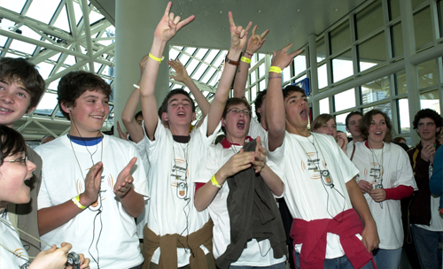 A young rock fan wearing an headset, right, listens to the Eagles of Death Metal perform during the "World's Quietest Concert," put on by Energizer at the Rock & Roll Hall of Fame in Cleveland, Monday, April 11, 2005. The event featured an audience that heard the concert through the headsets, instead of the usual loud amplifiers traditionally used during concerts.