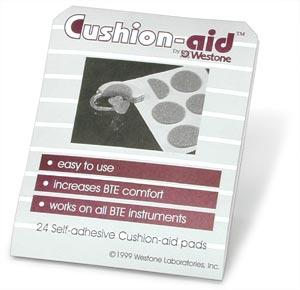 "The Cushion Aids™ that Westone provides our office have been found to have another use. We have found out by mistake that they also help and/or solve moisture problems for patients wearing BTEs. We place them on the underside of the hearing instrument with the curved half toward the patient's head. This allows the device and the skin not to be touching and therefore very little or no perspiration can get into the BTE. We have had many (more than 200) patients that have used this with excellent success. We just change the pads at the six month checkups as needed. It has saved them countless dollars for repairs. The patients can also change the pads themselves."