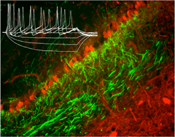 This image shows axons (in green) making synapses on the neurons (in red) that are responsible for computing sound location in the bird auditory system. The white traces show electrical activity from another class of neuron, which provides inhibitory input to the neurons shown in red.