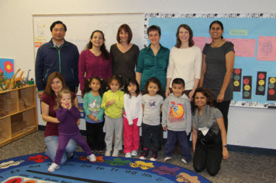 (l-r) back row, Gerald Chua, Lydia Reilly, Donna Lutz, Donna Tkacs, Patty Meyn and Sridevi Pulsani;front row, Ann Donaghue, children from Belmont Center, Anisha Parekh