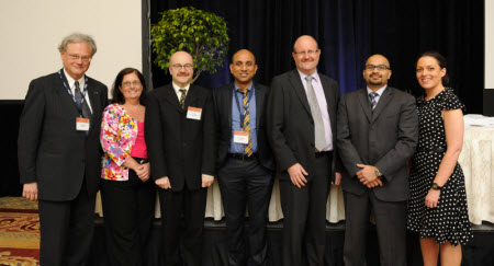 OSSEO GUEST PANELISTS (l-r) Dr Cor Cremers, Radboud University Nijmegen Medical Centre, Netherlands;Jane Sebzda, AuD , Children's Hospital of Wisconsin;Arjan Bosman, PhD , Radboud University Nijmegen, Medical Centre, Netherlands;Oticon Medical Director of Clinical Research and Professional Relations Ravi Sockalingam, PhD;Oticon Medical CEO Jes Olsen;Seilesh Babu, MD, Michigan Ear Institute and Becki Gladdis, BSc(Hons) Central Manchester University Hospitals NHS Foundation Trust, Manchester Royal Infirmary.